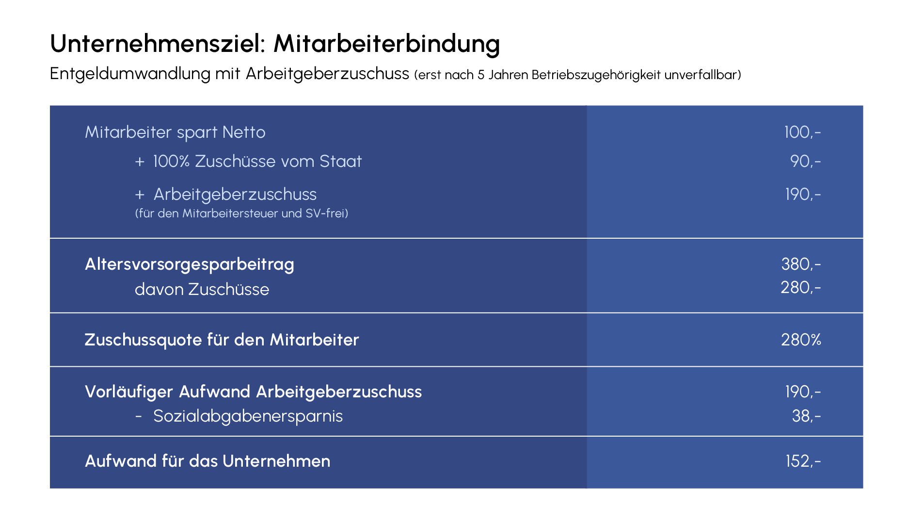 Vielleicht möchten Sie Führungskräfte und Leistungs- oder Kompetenzträger nicht nur motivieren, sondern stärker an Ihr Unternehmen binden? Der Arbeitgeberzuschuss fällt in diesem Fall natürlich höher aus, wird aber so gestaltet, dass er erst nach 3 Jahren unverfallbar ist. Verläßt der betreffende Mitarbeiter nach z.B. 2,5 Jahren Ihr Unternehmen, fliesst das auf dem bAV-Sparkonto befindliche Kapital aus dem Arbeitgeberzuschuss an das Unternehmen zurück. Das Beispiel zeigt, wie Sie den Staat über die Sozialabgabenersparnis aus der Entgelt-umwandlung an den Bindungskosten beteiligen können.