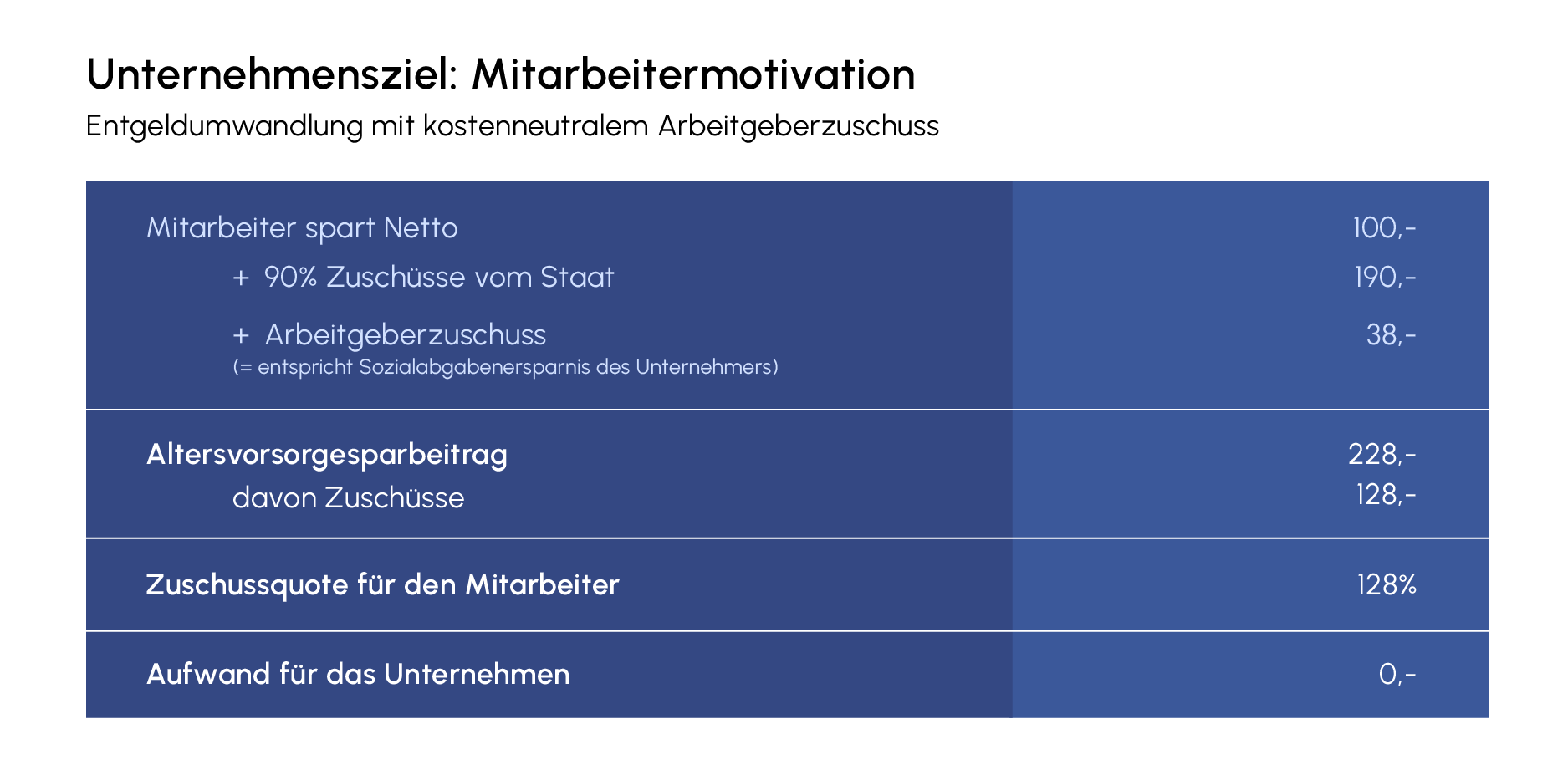 Das Beispiel zeigt, wie Sie Ihren Mitarbeitern bis zu 130 % Zuschüsse verschaffen können, ohne dass für Ihr Unternehmen Kosten entstehen. Denn der Arbeitgeberzuschuss, den Sie gewähren, refinanziert sich zu 100% aus der Sozialabgabenersparnis des Unternehmens durch die Entgeltumwandlung des Mitarbeiters. Das Unternehmen spart sogar noch die Umlagen 1-3. Und Ihre Mitarbeiter werden den Arbeitgeberzuschuss zu schätzen wissen.